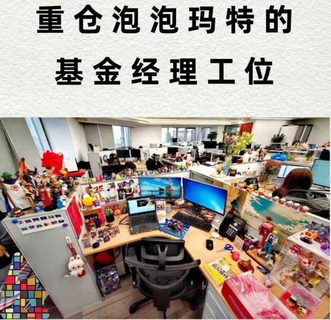 据了解,这是鹏华基金基金经理谢添元工位。这位出生在北京的“95后”不仅是投资者,也是消费者,各种潮玩、手办甚至卡游的卡片摆满自己的工位,其中就有泡泡玛特。