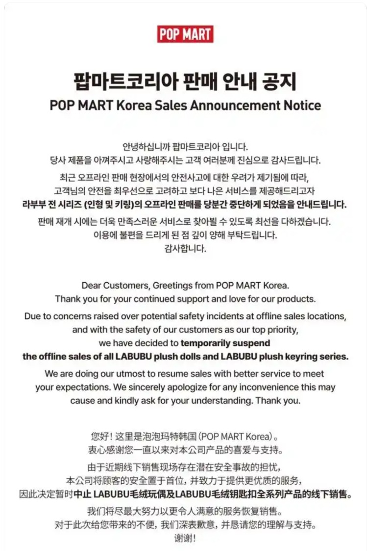 6月14日,泡泡玛特发布公告称,由于近期线下销售现场存在潜在安全事故的担忧,公司将顾客的安全置于首位,并致力于提供更优质的服务,因此决定暂时中止LABUBU毛绒玩偶及LABUBU毛绒钥匙扣全系列产品的线下销售。公司将尽最大努力以更令人满意的服务恢复销售。