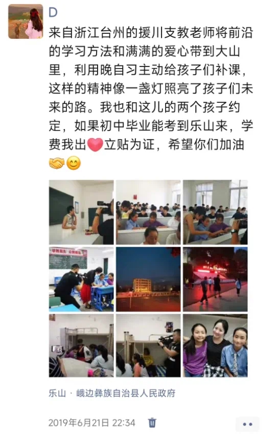 金枝说,当时就像看到了一束光,特别开心。从那以后,她更加努力,每天5时30分和一位闺蜜约好一起到楼道看书,冬天起来后迷迷糊糊的,就用冷水洗脸清醒,晚上回到宿舍后洗漱一下,又打开充电式台灯继续学习到深夜。段定然很希望金枝能考到乐山来,就找朋友杜芳琼老师帮忙。杜老师听了金枝的故事,马上主动说免费给金枝补习。后来每逢寒暑假,金枝就到乐山补习,住在段定然家。
