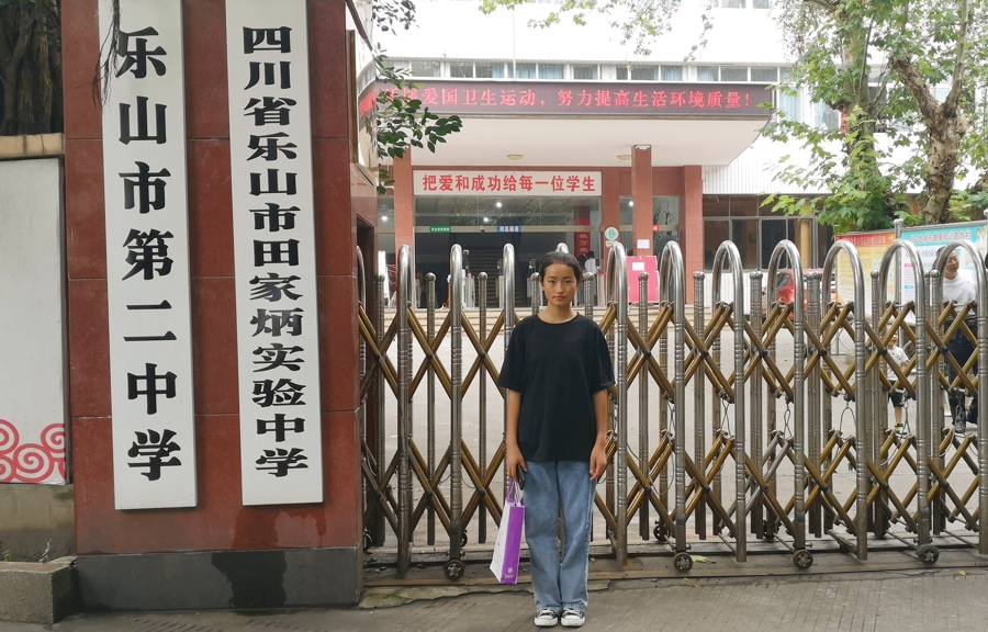 金枝穿着打工的烧烤店服装,在乐山二中的门口留念