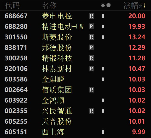 汽车产业链午后也集体拉升,汽车零部件方向领涨,板块指数放量拉升逾2%,创近3周新高。板块内个股掀涨停潮,菱电电控、精进电动等多股20%涨停,新坐标、西上海、嵘泰股份等近20股涨停或涨超10%。