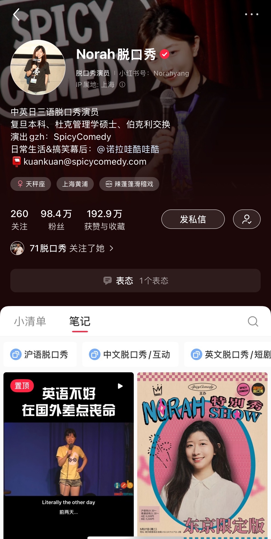 周六19时30分,位于上海新天地的“SpicyComedy”剧场内灯光渐暗。梳着高马尾、装扮简单随性的Norah掀开一侧的黑色门帘,在此起彼伏的欢呼声中,三步并作两步地冲上舞台。面对台下近200名观众,她用流利的英语讲起了开场白,语调轻快:“你们好!欢迎来到Norah特别秀!”