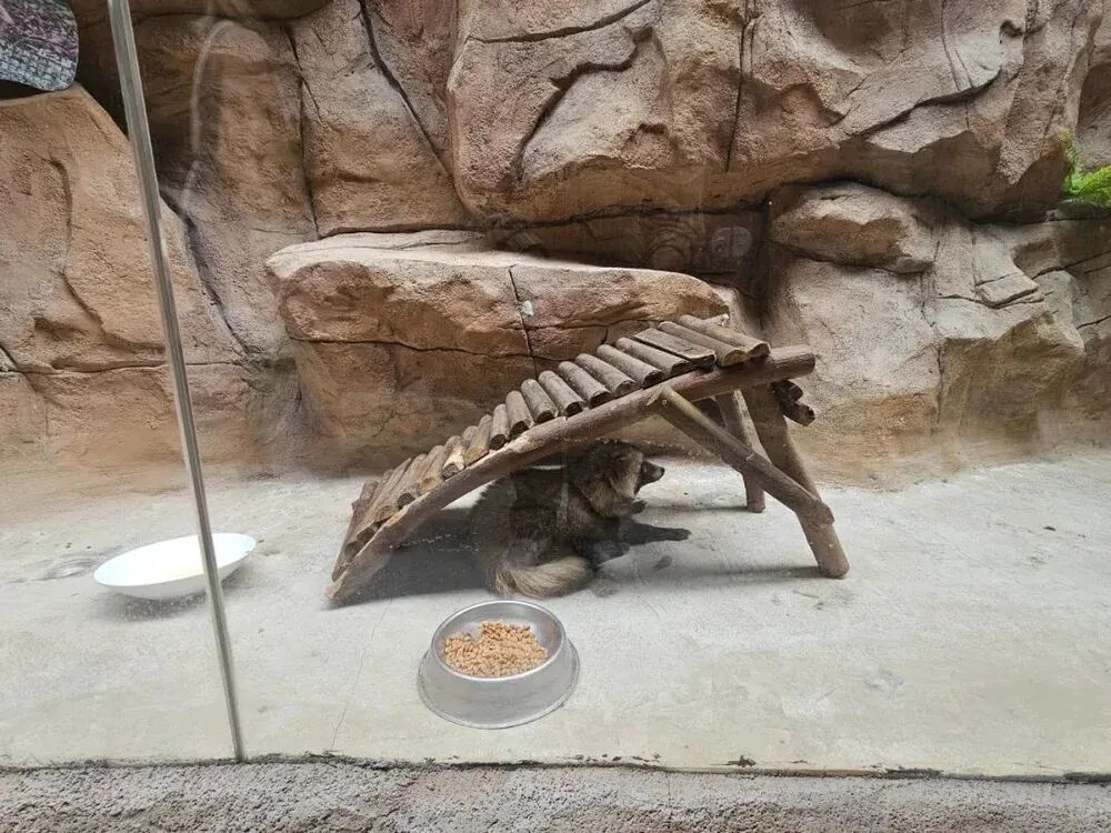 下图里的浣熊,长时间在笼舍顶下方扭动抓挠,这跟你在户外动物园看到的有些老虎狮子一直绕圈一样,属于刻板行为的表现。简单来说,就是抑郁了,精神异常了。