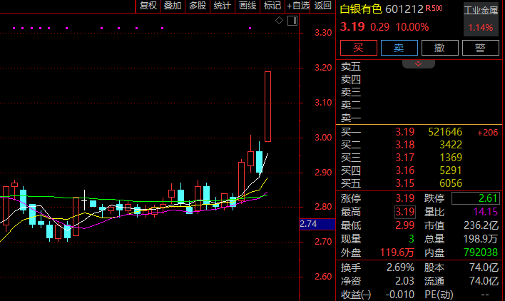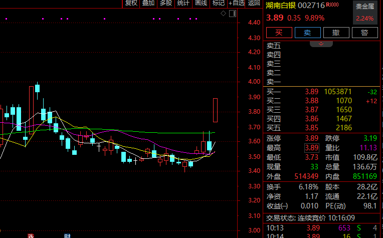 盘初,贵金属板块震荡走高,白银方向领涨。湖南白银、白银有色等涨停,兴业银锡、盛达资源涨超6%,中润资源、豫光金铅等涨幅居前。